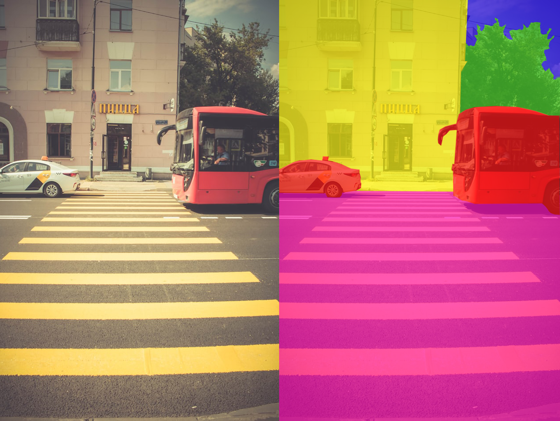 • Semantic segmentation classifies every pixel in the image according to its category, without distinguishing between separate objects of the same type.