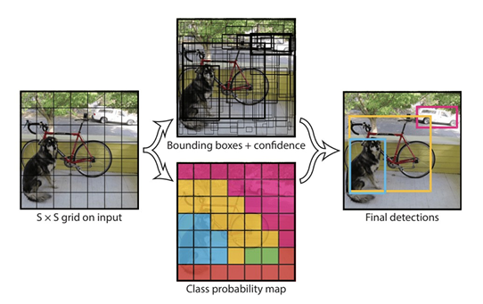 - The class probabilities map and the bounding boxes with confidences are then combined into a final set of bounding boxes and class labels.